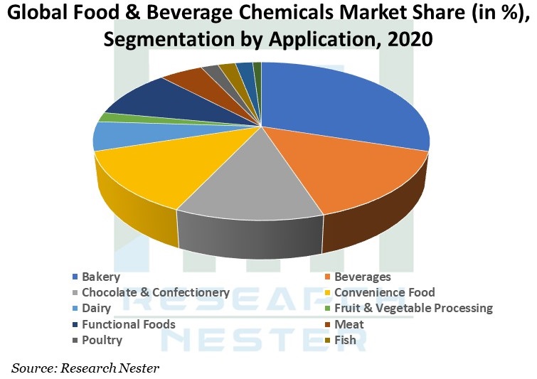 世界の食品および飲料用化学品市場は、さまざまな種類の食品に対する需要の高まり、消費嗜好の変化、個人の一人当たり収入の増加、人口動態の変化、ライフスタイルの変化により成長しています。 食品に対する嗜好の変化は、生存に不可欠な製品から健康と福祉に貢献する製品へと消費者の関心が高まっていることに起因すると考えられます。 世界の食品・飲料用化学市場は、2021年から2029年の予測期間中に顕著なCAGRで成長すると予想されます。 市場は、ベーカリー、飲料、チョコレートと菓子、インスタント食品、乳製品、果物と野菜の加工品、機能性食品、肉、家禽、魚、ペットフードなどに用途別に分割されています。 これらのセグメントの中で、ベーカリーセグメントは 2020 年に大きな市場シェアを記録し、予測期間中にさらに顕著に成長すると予想されています。 この部門の成長は、ベーカリーやレストランで食品の味、外観、香り、食感を向上させるための食品添加物の使用が増加していることに起因すると考えられます。 さらに、食品添加物はベーカリーでも食品の保存、着色、乳化、または甘味付けのために使用されており、ベーカリーにおける添加物などの食品化学品の需要がさらに高まることが予想されます。