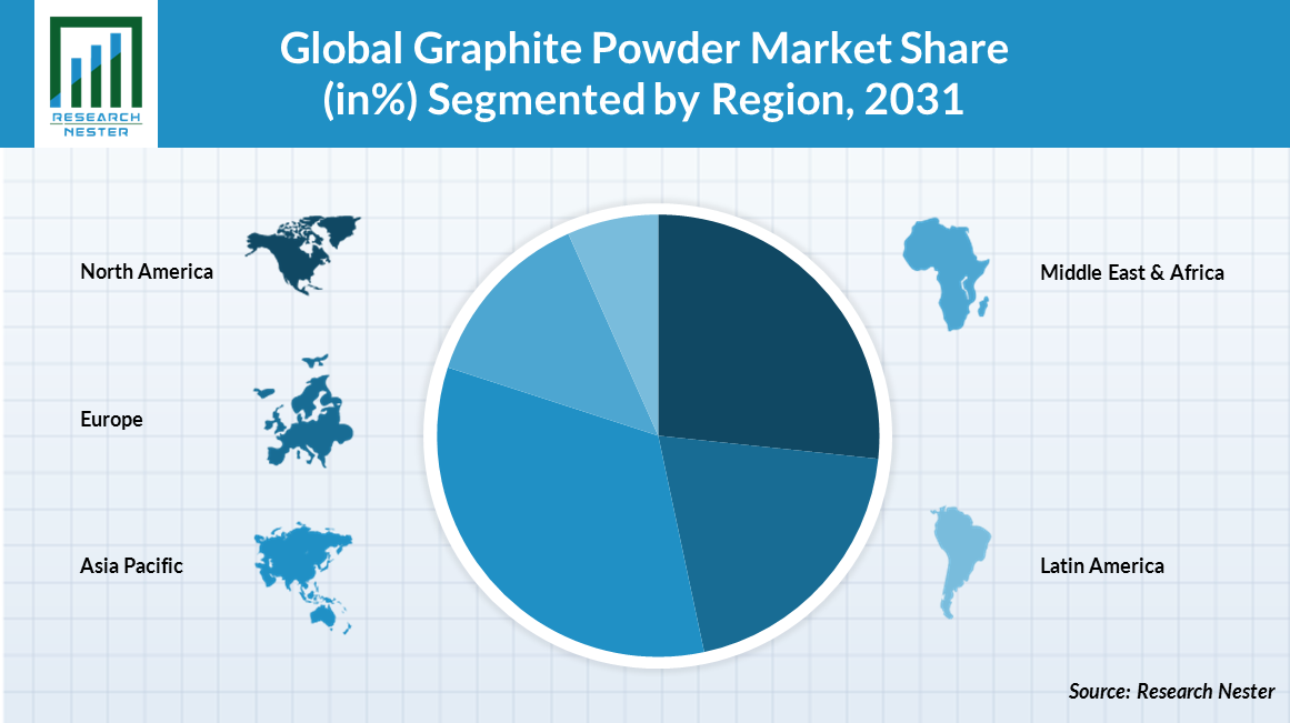 地域的には、世界のグラファイト粉末市場は、北米、ヨーロッパ、アジア太平洋、ラテンアメリカ、中東およびアフリカ地域を含む5つの主要地域で調査されています。これらの中で、アジア太平洋地域の市場は、2031 年末までに最大の市場シェアを保持すると予測されています。この地域は、急増する人口と急速な工業化により、最高の収益を得ることが期待されています。世界銀行のデータによると、2021 年には東アジアと太平洋地域の総人口の 61% が都市部に住んでいました。ただし、南アジアでは、同時期に総人口の約 35% が都市部に定住しました。また、アジア太平洋地域での自動車の販売と生産の増加は、グラファイト粉末市場の拡大のもう1つの成長要因になると予想されます。国際自動車製造業者のデータによると、アジア・オセアニア地域での自動車の生産台数は 46,732,785 台で、2021 年の自動車販売台数は 42,663,736 台でした。